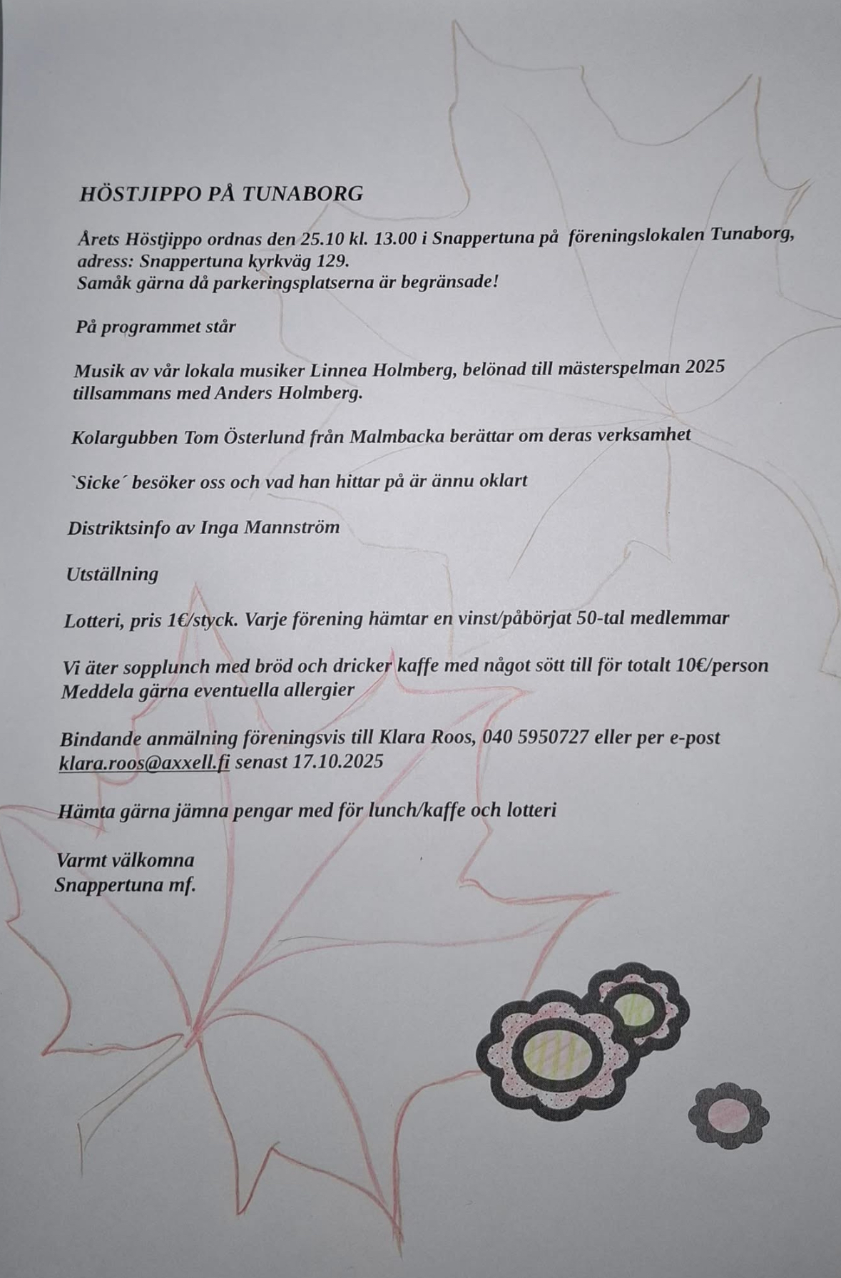 11.11 kl 13.00 Höstjippu i Svartå, Thorsborg På programmet ; Rafael Donner berättar om sin verksamhet som trädgårdsodlare och om sina planer på ökad verksamhet i Ekkulla, Kerstin Ilander berättar om Svartå, Risto Tammlehto underhåller med sång och musik. Svartåmarthorna sköter kaffeserveringen. Buss från Ekenäs resecenter kl 12.00